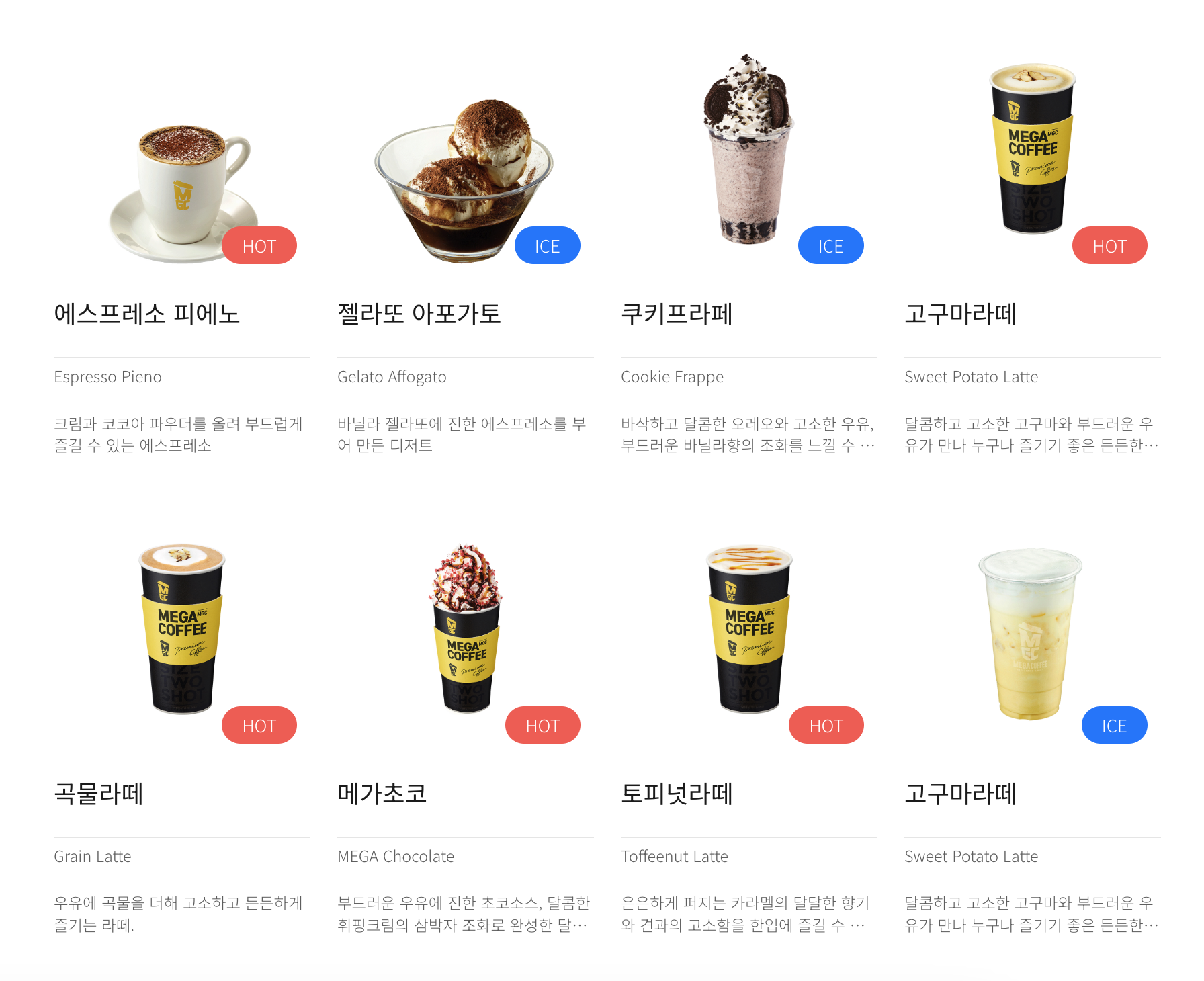 메가커피 메뉴와 가격에 대해서 말씀드리겠습니다.