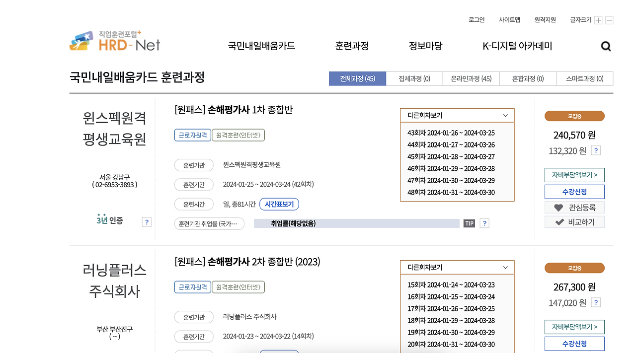 국민내일배움카드만 있다면 손해평가사 국비지원 교육에 참여할 수 있습니다. HRD-Net에서는 다양한 훈련과정을 제공하고 있으며, 손해평가사 관련 교육도 포함되어 있습니다.