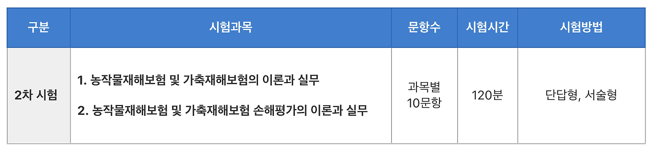 • 과목: "상법" 보험편, 농어업재해보험법령("농어업재해보험법", "농어업재해보험법시행령", "농립축산식품부 장관이 고시하는 손해평가 요령"), 농학개론 중 재배학 및 원예작물학