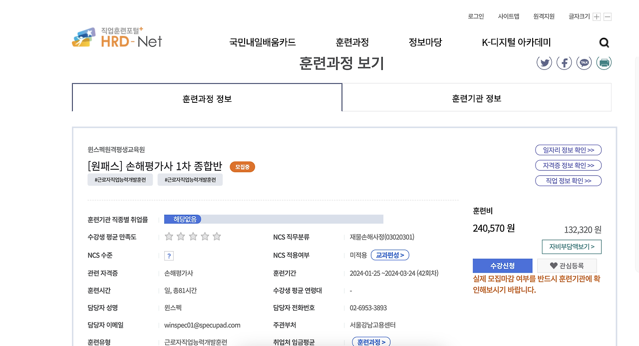 HRD-Net의 공식 홈페이지에서 국민내일배움카드를 활용한 손해평가사 국비지원 교육 정보를 확인할 수 있습니다. 바로가기를 통해 손해평가사 훈련과정을 미리 살펴보세요.