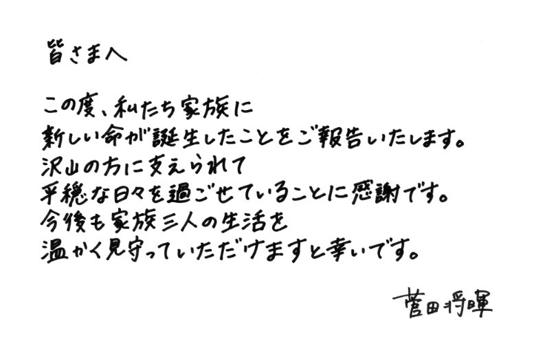 이번에 저희 가족에게 새로운 생명이 탄생했다는 것을 보고드립니다. 많은 분들의 도움으로 평온한 날들을 보내고 있는 것에 감사드립미다. 이후에도 가족 3인의 생활을 따뜻하게 지켜봐 주시면 좋겠습니다.