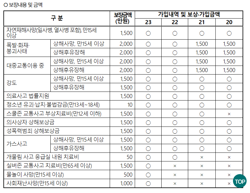 지자체별로 다르지만, 기본적으로 사망, 상해, 질병, 재난에 대해 보험금을 지급하며 최대 2000만 원의 보험금을 지급합니다.