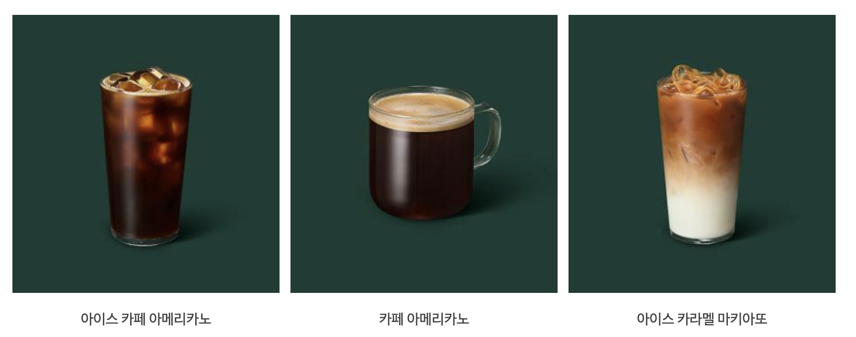 | 메뉴 | TALL (톨 사이즈) | GRANDE (그란데 사이즈) | VENTI (벤티 사이즈) |