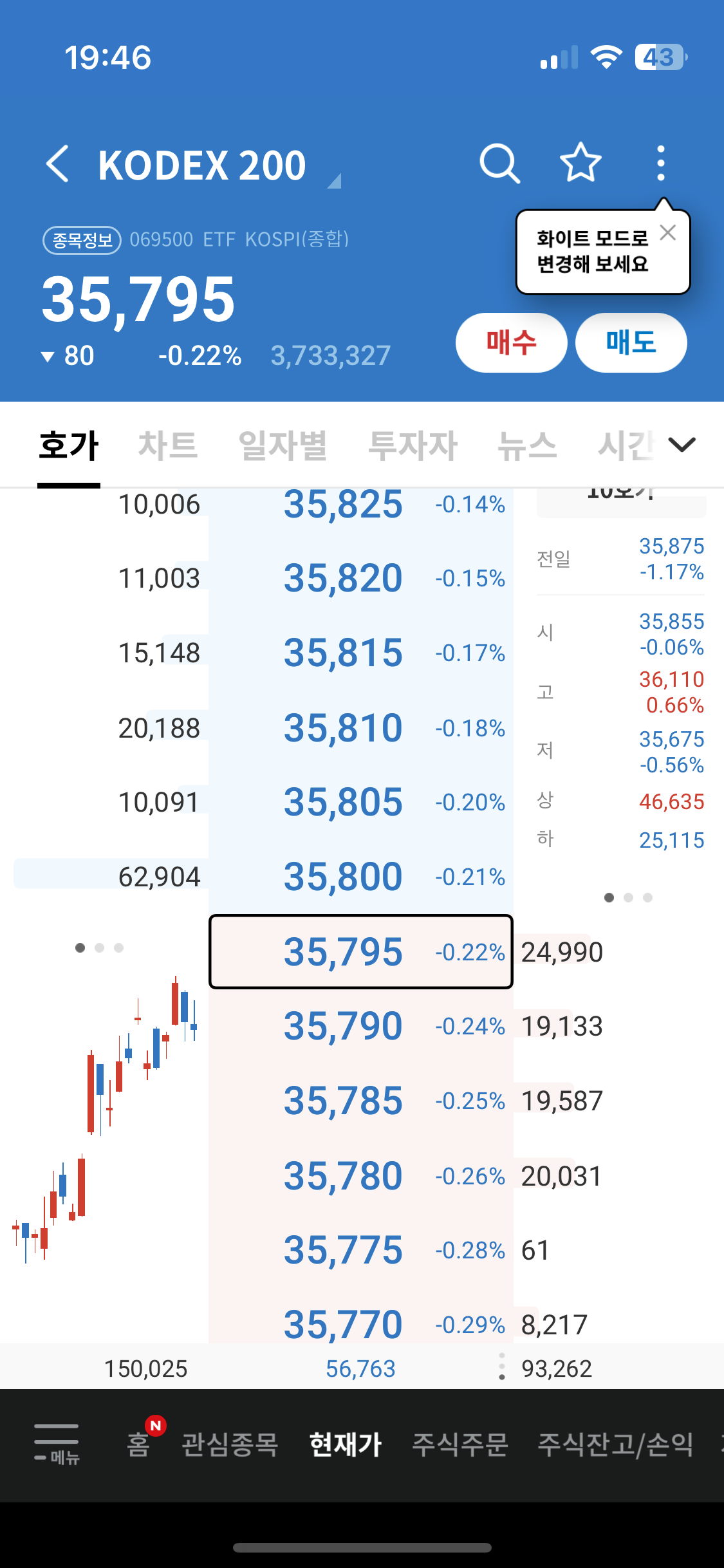 저는 ETF 주식 중에서 가장 유명한 KODEX 200을 누르겠습니다. (투자하려는 게 아니라 예시)